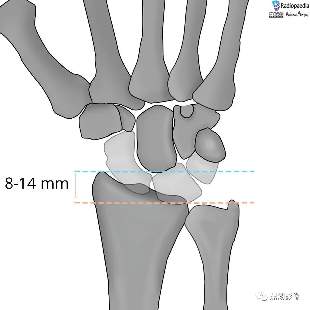 桡骨高度(Radial height):也称为桡骨茎突高度,首先作两条垂直于桡骨长铀的平行线,一条通过桡骨茎突的尖端,另一条通过月骨窝(桡月关节)的尺侧角,这两条平行线之间的距离称为桡骨高度。