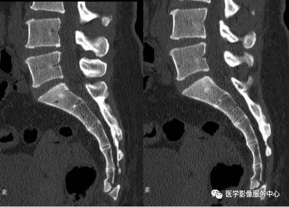 1、骶骨下部成角,并可见前缘骨皮质凹陷,但无骨折透亮线。也就是文中所提到的骶骨成角型变异(见图2-4);