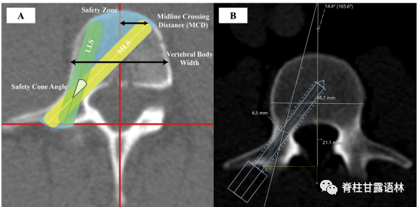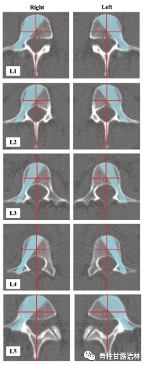 研究人员从“癌症影像档案”(The Cancer Imaging Archive, TCIA)在线数据库中随机抽取51例患者的CT扫描进行分析。使用Sectra 3D Spine软件创建3D渲染图,放置虚拟螺钉并进行测量。在每个腰椎,绘制左右椎弓根通道。在每个椎弓根处模板化两个螺钉位置,“内侧限制螺钉”(MLS)和“外侧限制螺钉”(LLS)。每个限制螺钉都是螺钉在不引起内侧或外侧骨折的情况下可以存在的最极端位置。安全区域定义为MLS和LLS之间的区域。测量每个水平(L1和L5之间)左右两侧的安全区域。