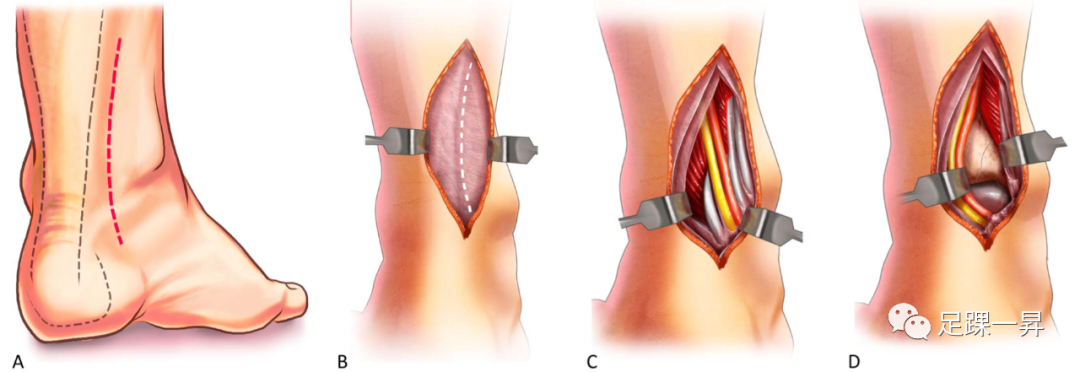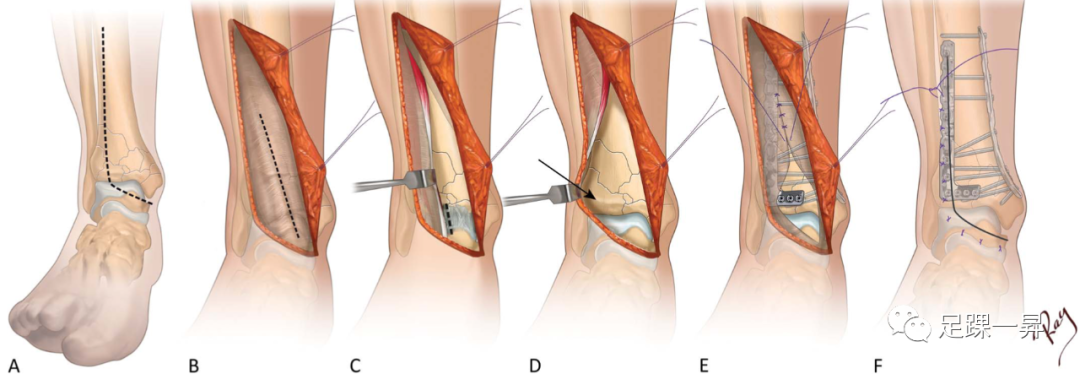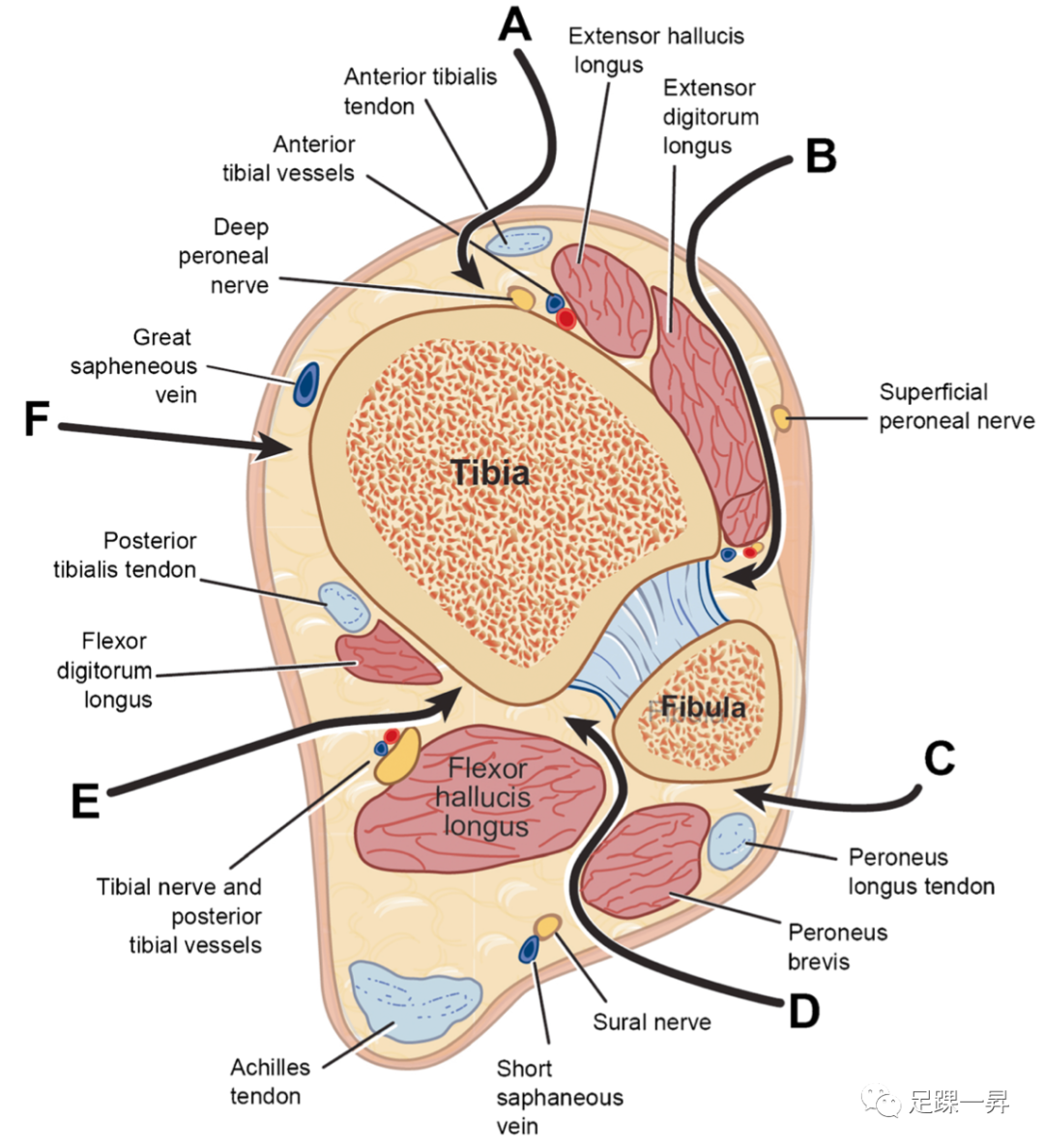 △图示胫骨远端水平的轴位切口示意图,描绘了标准手术入路的间隔,包括前内侧和扩展前内侧(A)、前外侧(B)、后外侧腓骨(C)、后外侧胫骨(D)、后内侧(E)和直接内侧(F)。