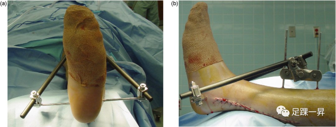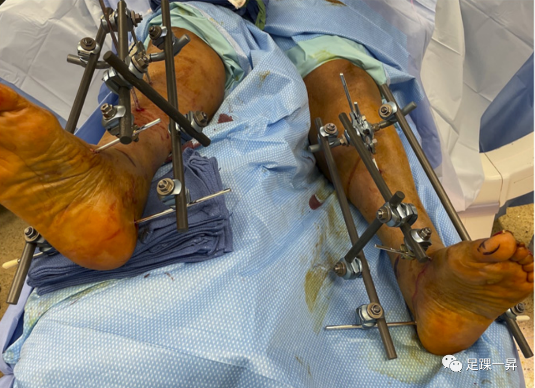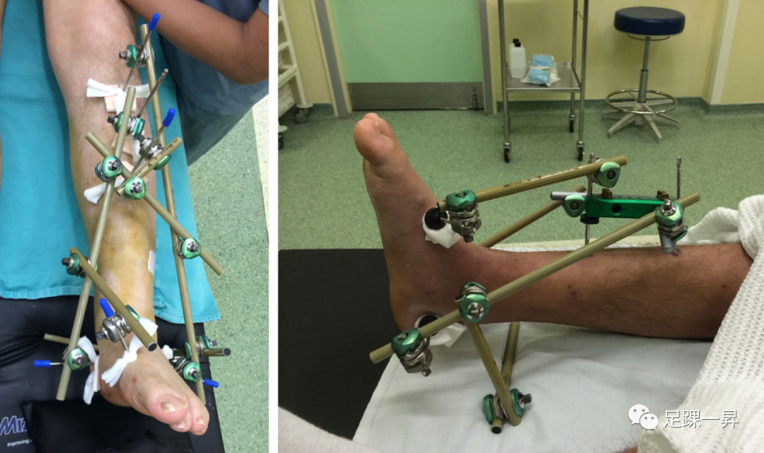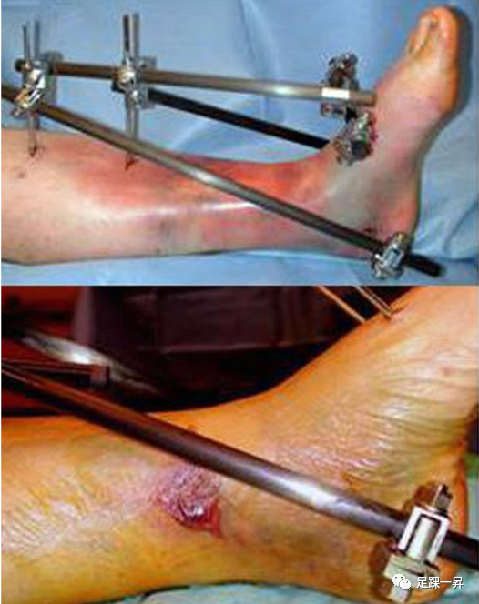 △图示外固定中添加第一跖骨固定钉将前足保持在跖行姿态。