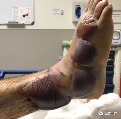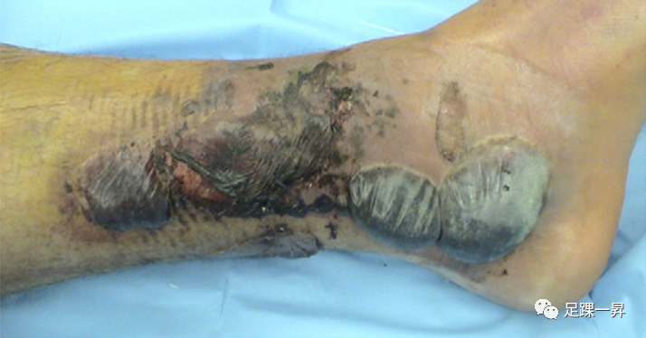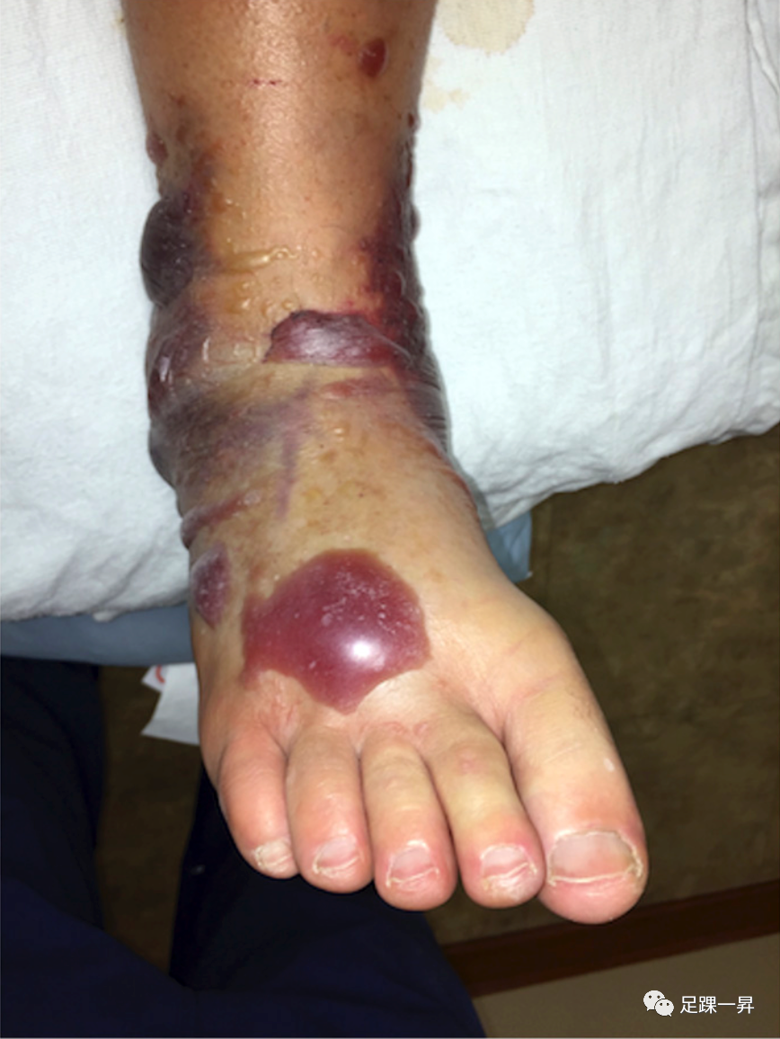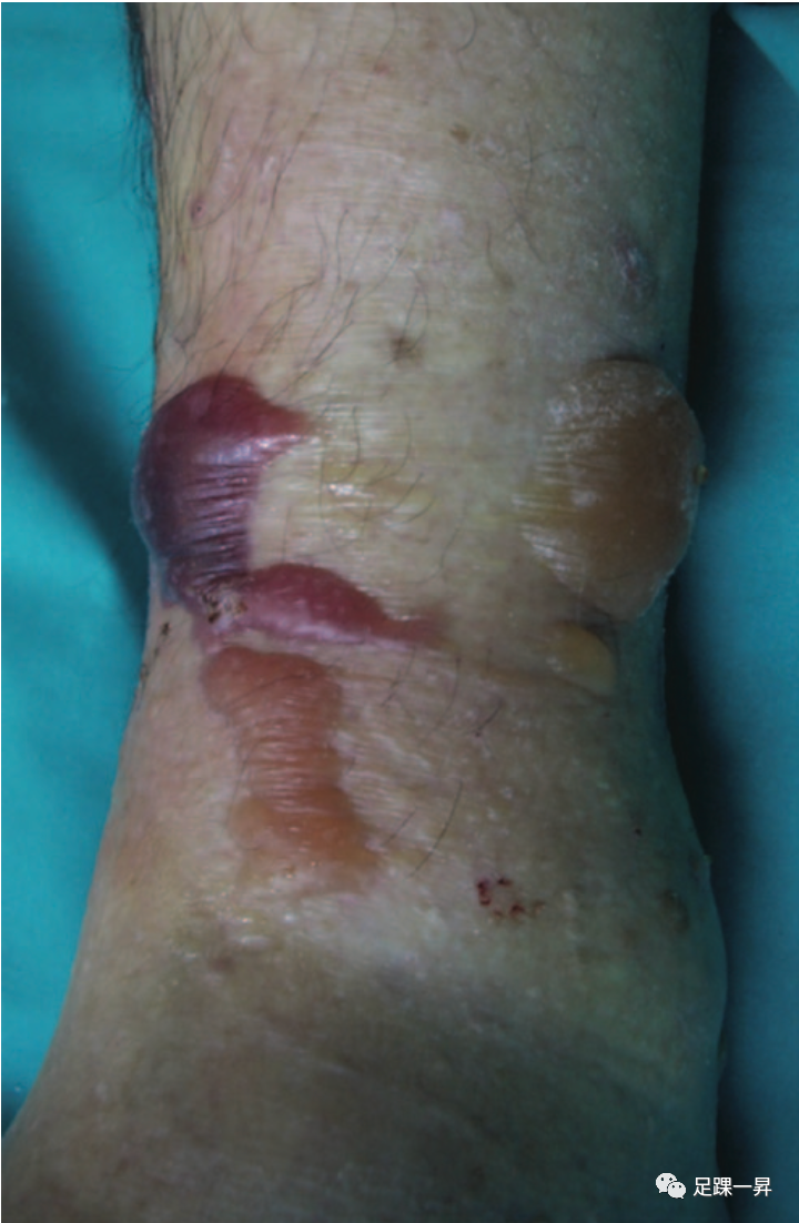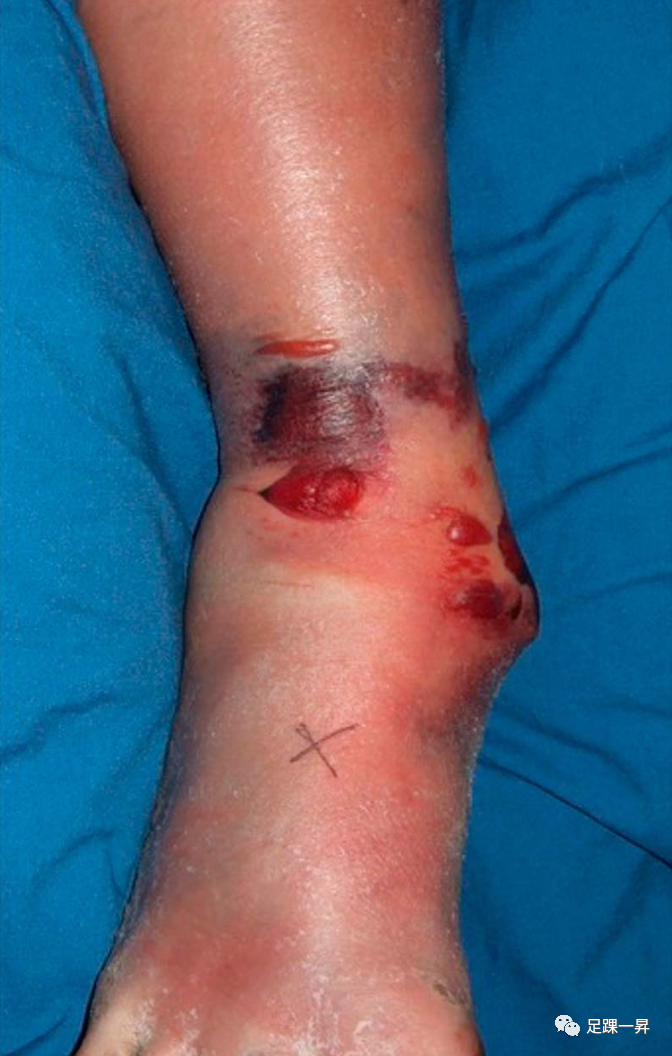 △图示高能量Pilon骨折患者系列四,通常伴有严重的软组织损伤,表现为明显的肿胀和骨折张力性水泡。
