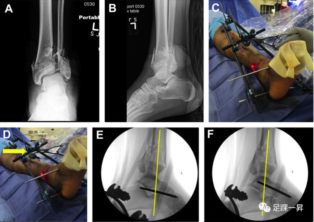采用临时外固定的分期治疗旨在通过牵引和韧带整复来恢复长度和力线,从而维持暂时复位。虽然没有随机对照试验比较分期治疗和早期确定性固定,但一些历史病例系列显示,在高能量Pilon骨折的情况下,采用早期确定性固定有相当大的并发症风险,包括深部感染率高达37% 。随后的几项回顾性研究评估了暂时性外固定的可行性。外固定后再行切开复位内固定术(ORIF),取得了令人鼓舞的结果。其中一项研究回顾性评价了56例43 C型损伤(34例闭合性和22例开放性),这些损伤最初采用临时外固定和延迟最终重建治疗,闭合性损伤平均治疗时间为12.7天,开放性损伤平均治疗时间为14天;闭合性骨折组29例中1例(3.4%)发生骨髓炎,开放性骨折组19例中2例(10.5%)发生深部感染。