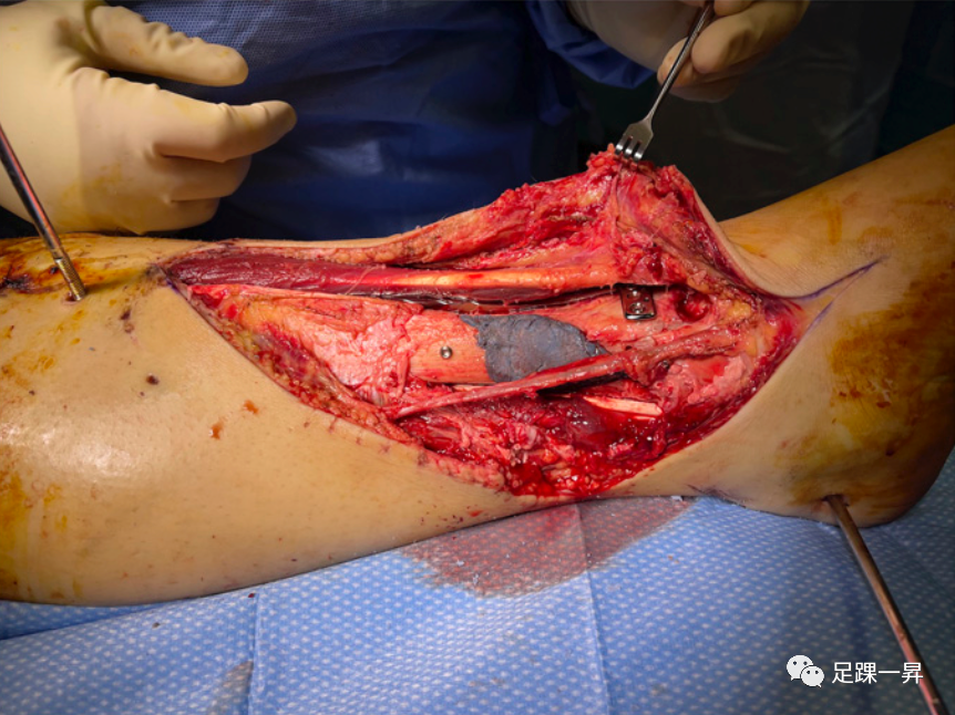 △图示术中照片提示高能开放性胫骨pilon骨折,前循环血供完全断裂。