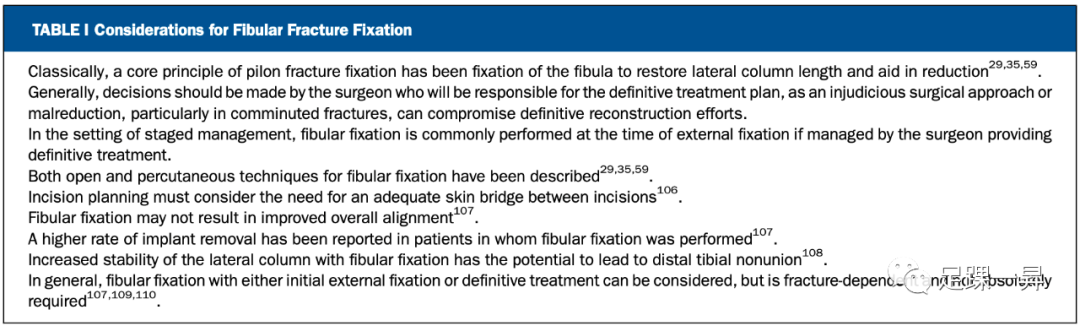 外固定,结合或不结合有限内固定,已被提出作为确定性治疗的概念,特别是在患者合并症或大量软组织损伤可能妨碍ORIF情况下。虽然急性确定性切开复位内固定在特定的胫骨Pilon骨折中被认为是可行的,但高能量损伤可能受益于分期入路,如据报道,高能量pilon骨折早期内固定后深部感染发生率较高。相反,一些研究结果可以接受,故提倡早期切开复位内固定。因此,最终治疗倾向于采用单一方法还是分期方法进行手术需根据术者经验和对个体骨折类型的判断。高能量Pilon骨折ORIF的术前计划需要仔细评估骨折类型、分类、软组织状态和患者因素。决定是否进行腓骨切开复位内固定是多因素的(表I)。