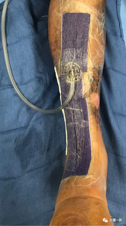 △图示Pilon骨折术后采用负压伤口辅料来覆盖伤口。