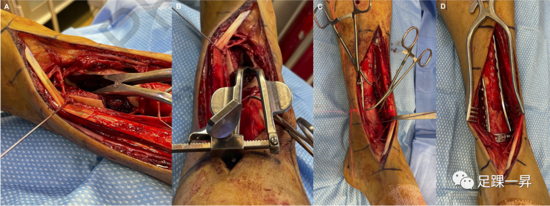 △图示Pilon骨折的术中照片,其中Chaput骨块和内侧骨块之间的骨折线被“翻书样打开”,以便于更靠后地接近压缩区域。一旦后侧复位工作完成,将Chaput骨块和内侧骨块复位并进行固定。