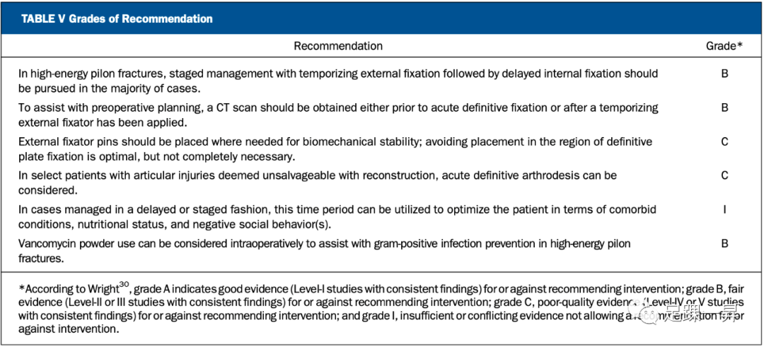 △表V Pilon骨折的治疗建议以及对其建议的推荐等级。推荐分为A、B、C和I四个等级,代表不同程度的证据等级支持或反对相关行为。