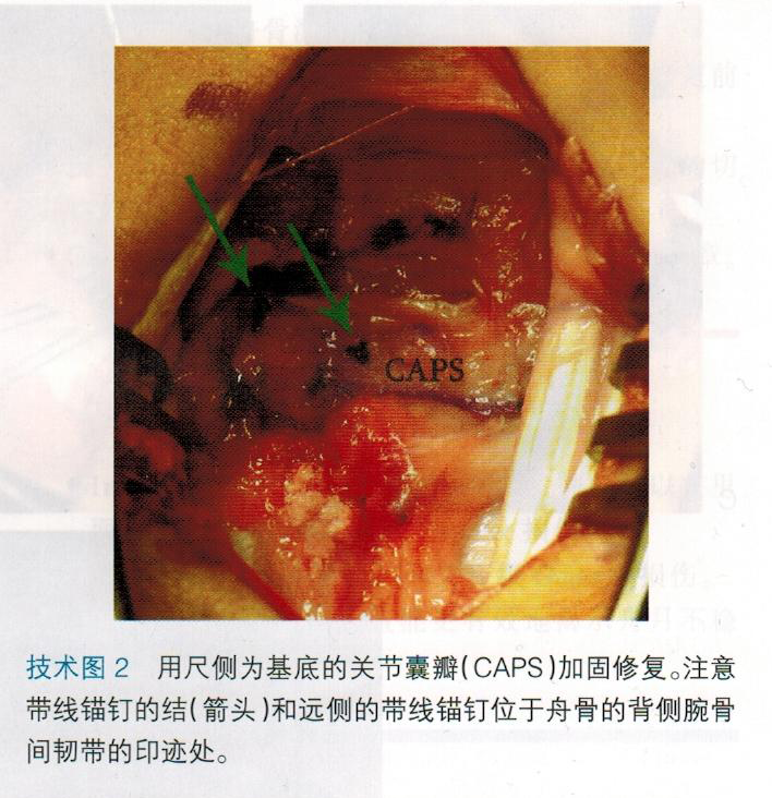 1、指征●SLIL修复薄弱●慢性舟月分离(6周)不伴关节炎—畸形不是固定的而是可复性的2、如果需要关节囊固定来加固,先像上面一样修复SLIL,同样作尺侧基底的关节囊切口。3、在SLIL修复后,把尺侧基底的关节囊瓣覆盖过舟月间隙,以舟骨腰部作它的止点,缝合。●缝合时保持张力,进一步稳定舟月关节。4、在舟骨的预定位置拧入1枚或2枚mini带缝线锚钉(1.8mm或2mm),另一枚带缝线锚钉拧入月骨中央。5、拉紧关节囊把舟骨的锚钉缝线穿过关节囊瓣。再把月骨的缝线穿过关节囊中央,估计缝合的位置,最大程度地稳定舟月关节。6、所有的缝线都穿过关节囊后,打结(技术图2)。