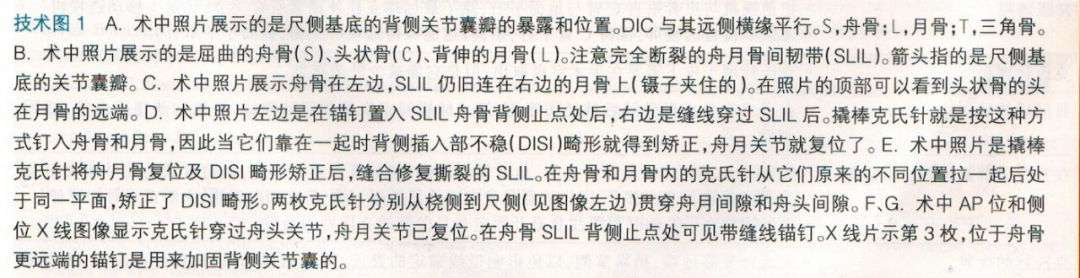 10、先将舟月关节初步复位,找出SLIL的解剖止点。11、先将舟骨尺背侧缘止点处打磨毛糙致骨面出血,然后在此拧入一枚或多枚mini带缝线锚钉(2.0mm或2.5mm)。12、将锚钉的缝线缝过SLIL,先不要收紧(技术图1D)。13、用撬棒将关节复位后,从舟骨到月骨打入2枚0.045in(1.14mm)克氏针,然后从舟骨腰部到头状骨打入1~2枚0.045in(1.14mm)克氏针(技术图1E~G)。14、将锚钉缝线打紧,把SLIL固定于预定位置。15、去除撬棒克氏针,将保留的克氏针尾部剪断埋于皮下。16、如果DIC韧带撕脱,需要缝合,或者需要关节囊瓣加固,则在舟骨背侧更远侧的止点处拧入带缝线锚钉(见背侧关节囊固定直接修复SLIL)。17、用3-0可吸收线缝合关节囊。18、将EPL肌腱移至皮下,用3-0可吸收线修复伸肌支持带。
