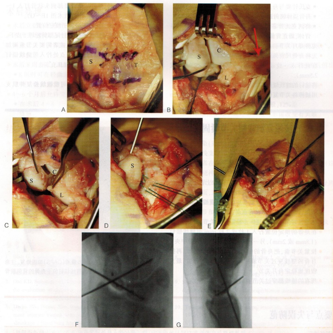 1、伴有或不伴有关节囊固定的直接SLIL修复的特殊指征。●GeisslerIII级或IV级完全SLIL损伤●损伤<6周 —损伤3个月后,韧带很少可直接修复●桡腕关节和腕中关节退变很少●X线片上的静态不稳表现是不恒定的●足够的SLIL韧带残留2、于Lister结节尺侧缘背侧作标准的纵切口,切至伸肌支持带。3、牵开伸肌支持带处的皮瓣,暴露伸肌支持带远、近侧缘。●桡神经浅支和尺神经背侧皮支包括在皮瓣中。4、在第3伸肌间室打开伸肌支持带,将拇长伸肌腱(EPL)牵向桡侧。5、暴露背侧关节囊和背侧外在桡腕韧带[背侧桡腕韧带(DRC)和腕骨间(DIC)韧带]。6、切开背侧关节囊,保留1~1.5mm尺侧为基底的关节囊瓣(技术1A)。●保留尺侧基底是为了在有需要的时候关节囊瓣可以用作关节囊固定或加固修复。●关节囊瓣与DIC平行,包括关节囊及部分DIC和DRC。7、暴露好舟骨、SLIL和月骨,检查有无关节炎改变、SLIL撕裂部位(典型的是从舟月撕脱)(技术图1B、C)及DIC韧带有无损伤。8、在高能量损伤中DIC常从舟月骨附着处撕脱。9、在舟骨和月骨上分别打入一枚克氏针[0.062in(1.57mm)]作撬棒。●克氏针要与舟月关节平行,距关节面5mm。●舟骨撬棒朝向近侧,月骨撬棒朝向远侧(技术图1D)。●将两克氏针靠向一起,让舟骨不再屈曲,月骨不再背伸,矫正背侧插入部不稳畸形,使关节复位。