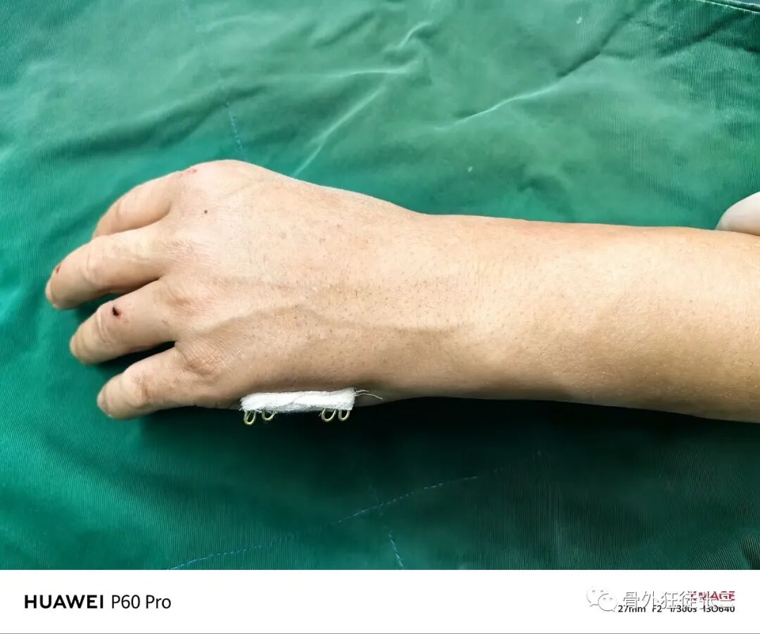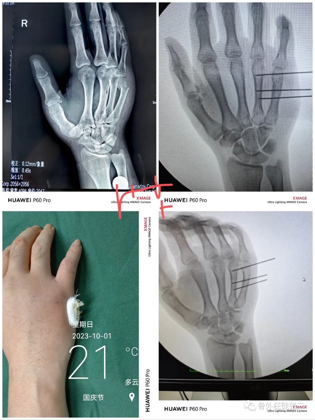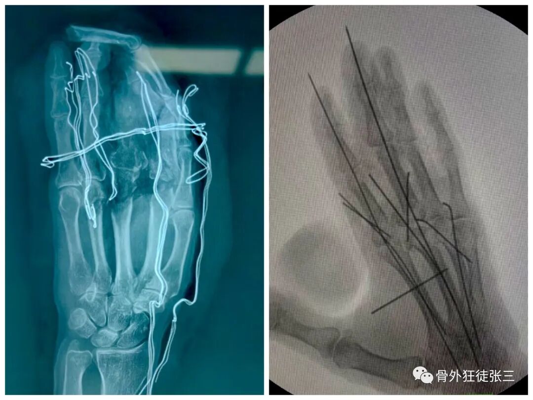 病例5,开放性第3、4掌骨骨折,隔山打牛,克氏针支架。