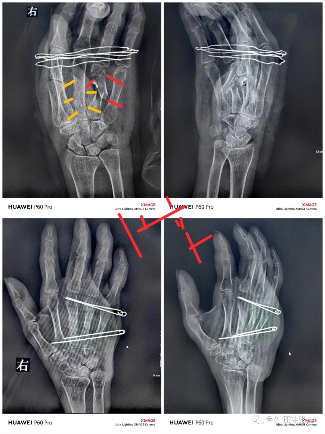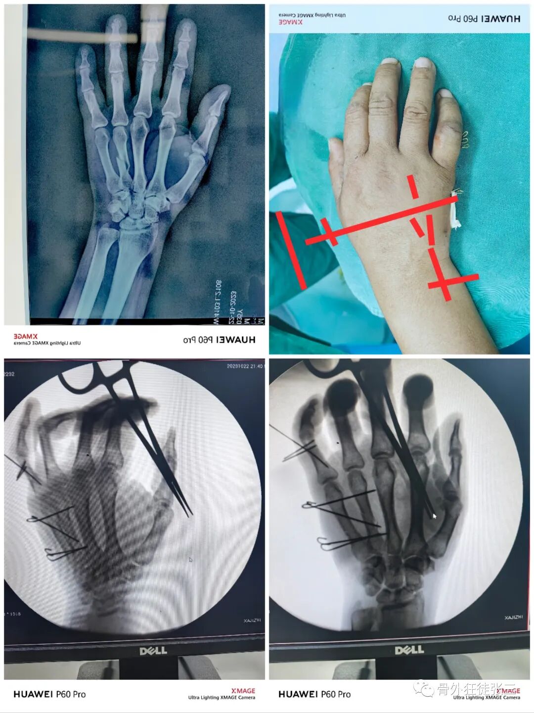 病例9,第4掌骨螺旋骨折,指骨骨折,闭合复位,克氏针支架。