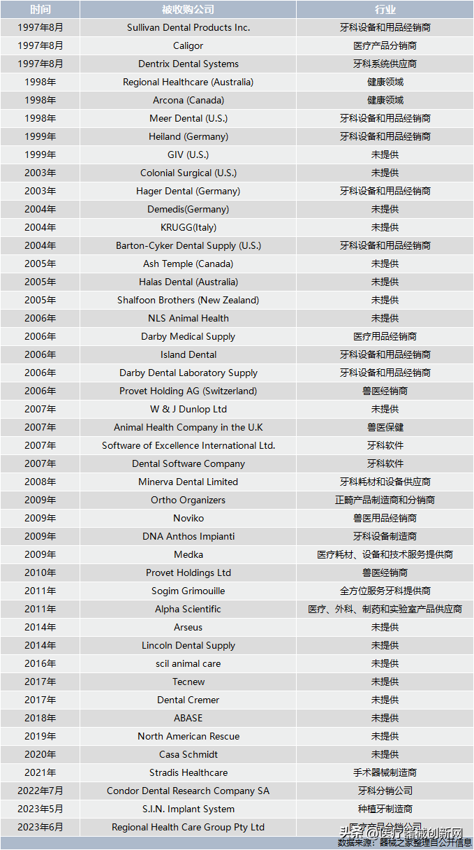 公司在1997年以3.18亿美元收购 Sullivan Dental Products公司一举成为全球最大的牙科设备和用品经销商。此后的25年中公司又陆续收购了超过40家企业,不断巩固自身“龙头”的地位。其中2023年就有多启并购发生。