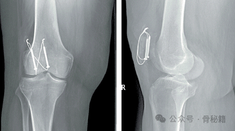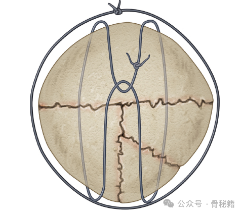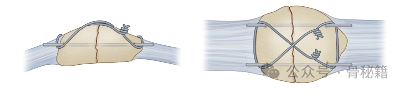 以垂直、平行的方式放置 1.6 mm 克氏针或 4.0 mm 松质骨螺钉,以维持复位并锚定环扎线。还可以将复位装置取下,以使克氏针以逆行方式穿过骨折部位。然后将 14 或 16 号血管导管或等效物穿过邻近髌骨、克氏针尖端后方的髌骨和股四头肌腱。这可以最大限度地减少环扎线和骨头之间的软组织。然后将 18 号线以圆形或十字形 8 字形穿过导管。确保关节面复位后,将线拉紧。当使用八字形图案时,内侧和外侧环应对称收紧。然后将克氏针的近端弯曲、扭转,使其面向后,围绕环扎线,然后埋入近端髌骨中。然后切割克氏针多余的远端