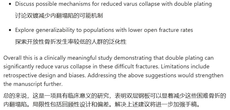 我们选择了一篇2023年6月发表的一篇骨科论文,主要对比了股骨远端粉碎性骨折的双钢板治疗相比于单钢板可以更好地预防术后内翻畸形。