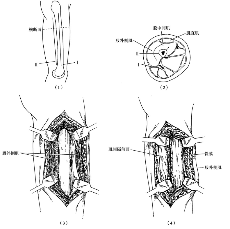适应证:股骨干广泛外伤、肿瘤或其他病变需彻底切除并需用各种植入物固定者。体位:斜俯卧位,患侧在上。操作步骤:1.将患者的患侧略垫高,在股骨大转子基底部至股骨外髁连线上作纵形切口,后外侧切口则稍靠后(图3(1)(2))。2.沿髂胫束的前缘切开浅筋膜及阔筋膜。将股外侧肌及股中间肌顺肌纤维方向切开。3.于臀大肌前缘切开骨膜,将其自股骨上适当剥离。在进入股骨上1/4段时,可遇到旋股外侧动脉的分支;而在进入股骨下1/4段时,则遇到膝上外动脉,均可切断结扎。必要时,可采用此途径(外侧径路)显露全股骨干,但不如后外侧切口更方便(图3(3))。4.如拟作后外侧切口,应显露股外侧肌的后部,并将其牵向前侧。沿外侧肌间隔的前面继续进行分离直达股骨。外侧肌间隔附着于股骨粗线。将深部组织向前侧牵开,沿切口方向切开骨膜。用骨膜剥离器在骨膜下剥离股中间肌,其范围视需要而定(图3(4))。此途径的缺点是:如患者肌肉发达,股外侧肌较难牵开;此外,在大腿中1/3,从股外侧肌横形穿入的股深动、静脉第2穿支易被切断,应预先结扎、切断。不要分离股二头肌长、短头,以免损伤坐骨神经。