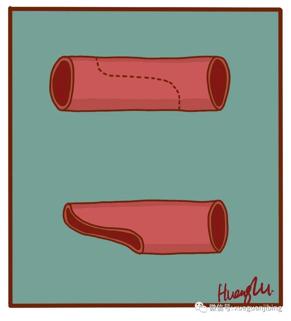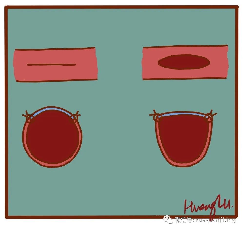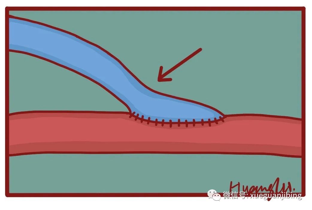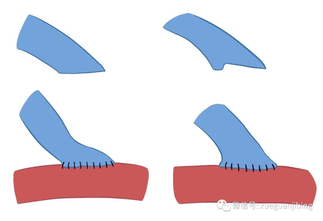 宿主动脉的动脉壁切口长度要足够长,有的时候甚至达到其直径的3倍,移植血管与宿主动脉之间的角度不宜过大,而且宿主动脉选择卵圆形切口的话会导致移植血管狭窄(见下图),可使用血管补片来避免这种情况。