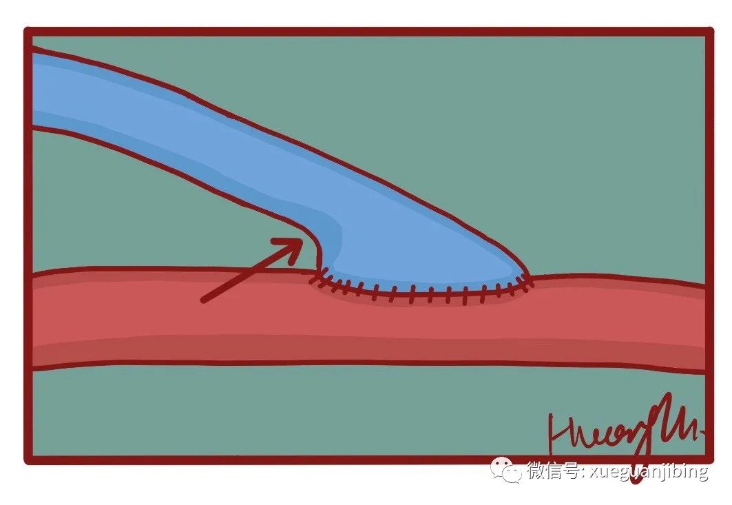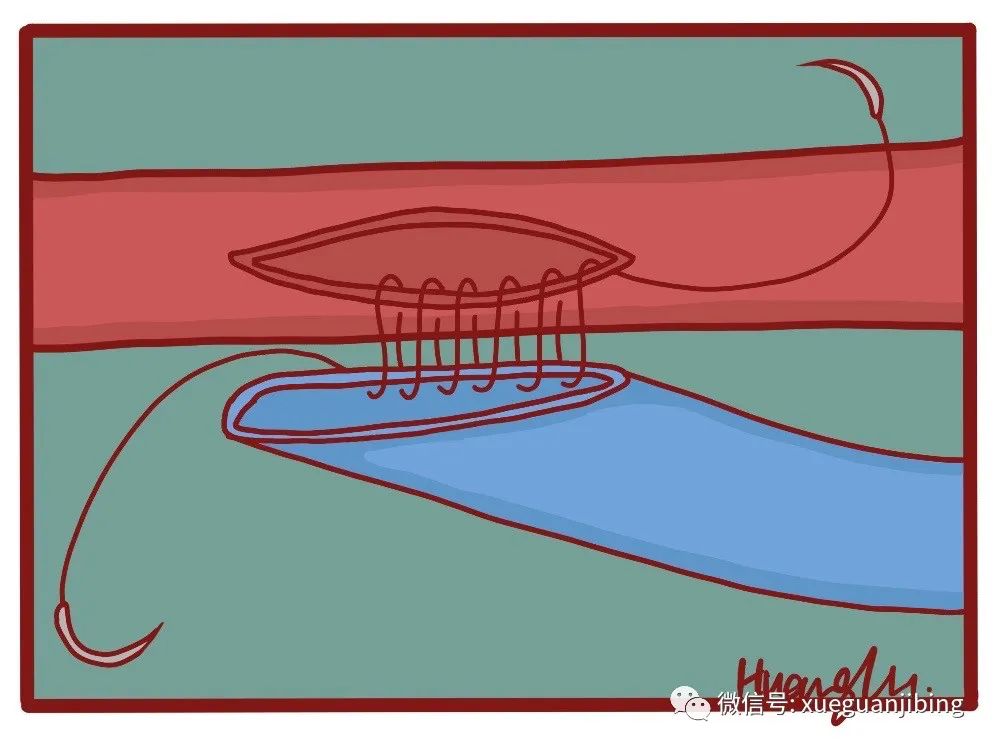 在熟悉了血管缝合方法后,再来说说血管吻合。血管吻合的基础是端侧吻合,掌握端侧吻合基本技术后,可以将其应用在端端吻合、侧侧吻合以及人工血管补片等。端侧吻合技术是血管旁路移植术中的最常用技术,也就是把一根移植血管(可以是自体血管,比如大隐静脉、头静脉等,也可以是人工血管),缝合在另一根宿主血管的侧面,经常用在各种血管搭桥、透析通路建立等等。如下图,红色的就是宿主血管动脉,蓝色的就是移植血管。