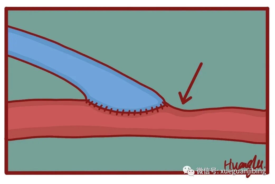 在端侧吻合的时候,最容易产生狭窄的地方是在尖部的宿主动脉、尖背部的移植血管、跟部的移植血管等这些部位,见下面这几幅图的箭头所指。