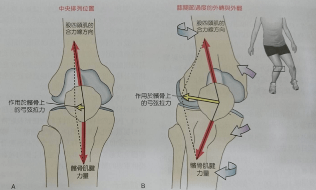 另外一个可能则是→【承重或深蹲时的膝内扣(Knee valgus)】,瞬间承重时的膝内扣,或是深蹲时的内扣,都会让股四头肌拉力向外,往外拉扯得力矩瞬间增加,把髌骨往外带离原有的轨迹→髌骨撞到隔壁邻居→髌骨外翻。