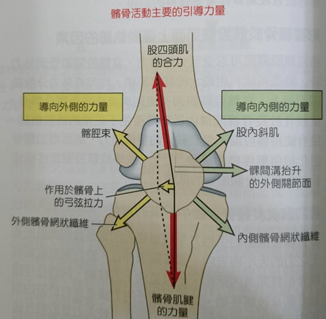红色是主要干道,由股四头肌和髌骨肌腱所组成黄色的线是将髌骨外外拉的力量:髂胫束,外侧髌骨网状纤维绿色的线是将髌骨往内拉的力量:股内斜肌,关节面,内侧髌骨网状韧带