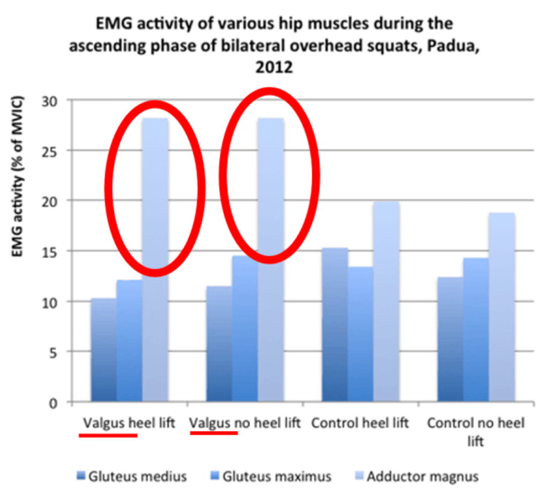 他在测试深蹲时,膝盖朝前(控制组)与膝盖内扣,脚跟翘起与否肌肉活化的不同。以下是结果: