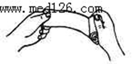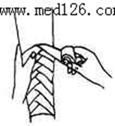 螺旋反折包扎法:用于周径不等部位,如前臂、小腿、大腿等,开始先做二周环形包扎,再做螺旋包扎,然后以一手拇指按住卷带上面正中处,另一手将卷带自该点反折向下,盖过前周1/3或2/3。每一次反折须整齐排列成一直线,但每次反折不应在伤口与骨隆突处。