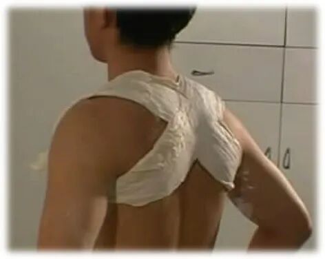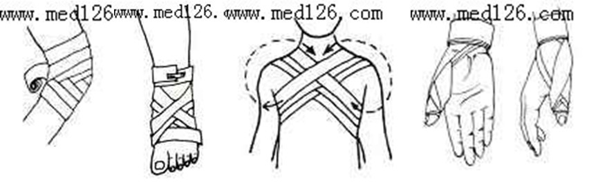 “8”字形包扎法:用于肩、肘、腕、踝、等关节部位的包扎和固定锁骨骨折。以肘关节为例,先在关节中部环形包扎2卷,绷带先绕至关节上方,再经屈侧绕到关节下方,过肢体背侧绕至肢体屈侧后再绕到关节上方,如此反复,呈“8”字连续在关节上下包扎,每卷与前一卷重叠2/3,最后在关节上方环形包扎2卷,胶布固定。