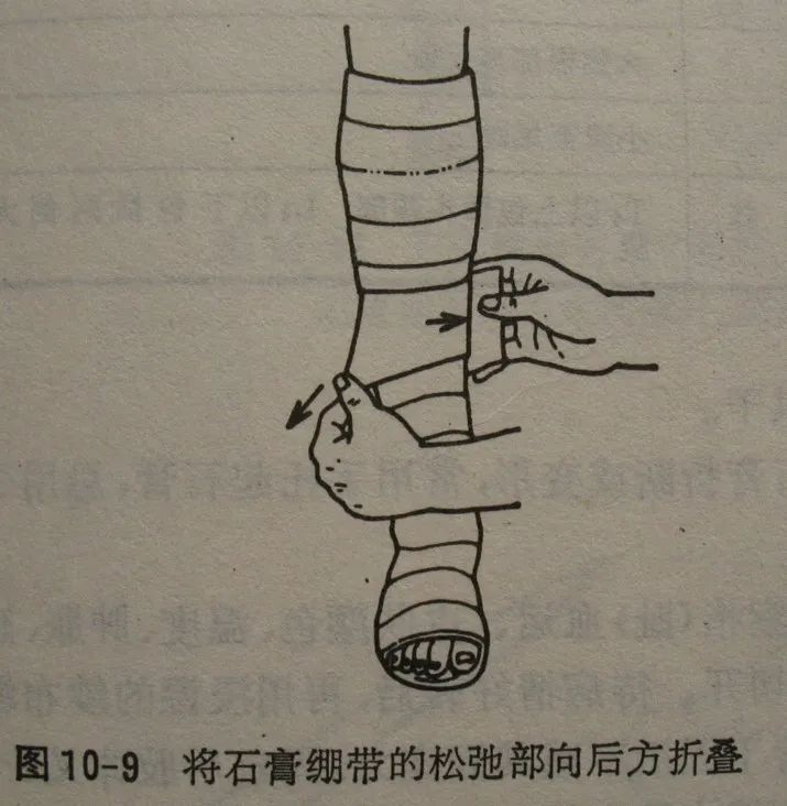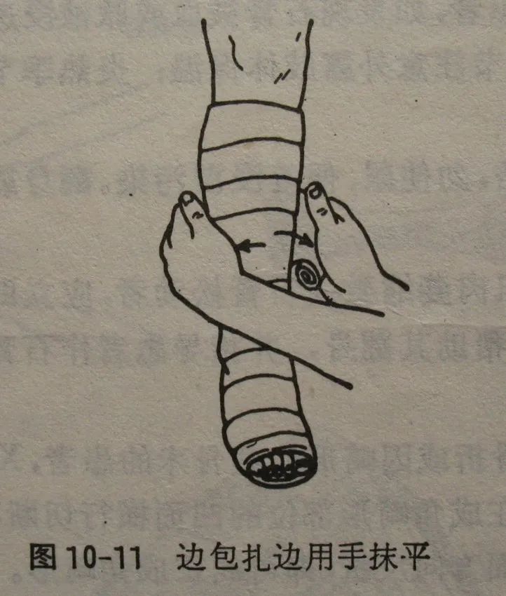 4、必须保持石膏绷带平整,勿使形成皱褶,尤其在第1-2层更为重要.由于肢体的粗细不等,当需向上或向下移动不等时,要提起不等的松弛部并向肢体的后方折叠,切不可翻转绷带.操作要迅速、敏捷、准确,两手要互相配合,即用一手边缠绕绷带,另一手边朝相反的方向抹平,使每层石膏紧密贴合,勿留空隙。