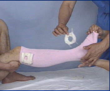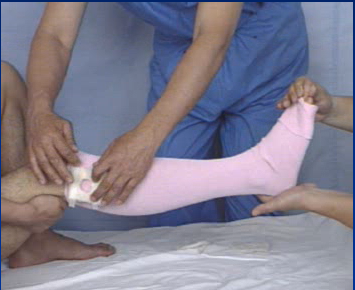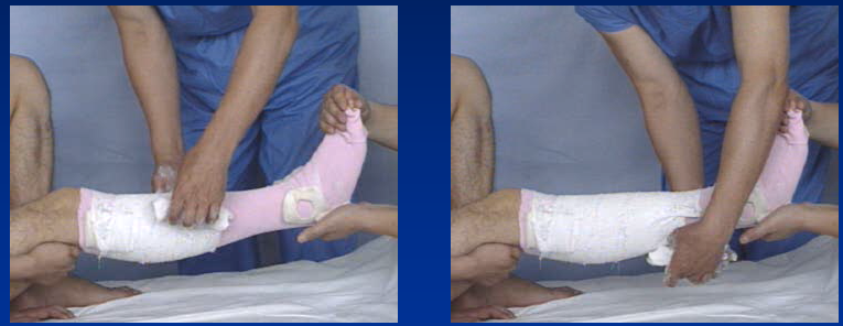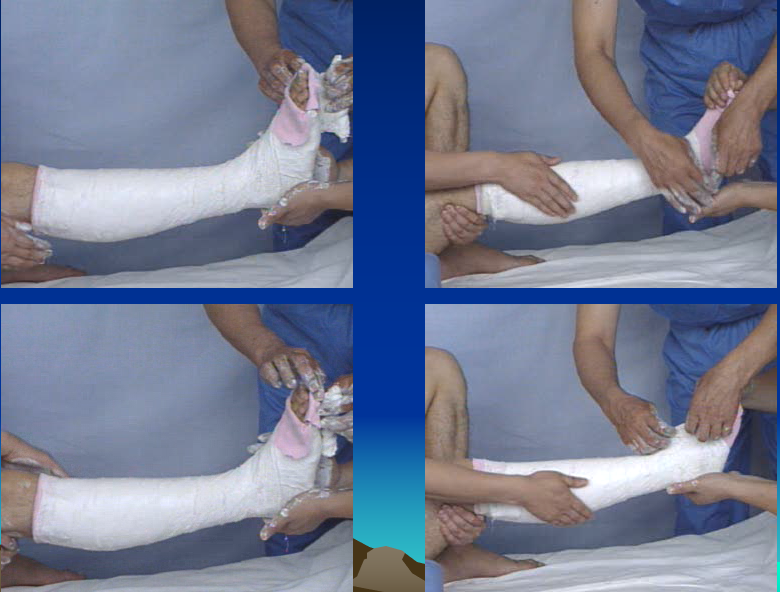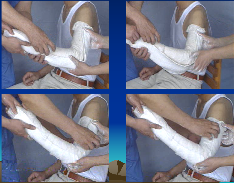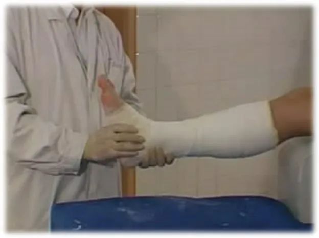 3、在环绕包扎时,一般由肢体的近心侧向远心侧缠绕,且以滚动的方式进行,且勿拉紧,以免造成肢体的血循环障碍.每一圈石膏绷带应盖住上一圈石膏的 1/3,这样才能使整个石膏绷带凝成一整体