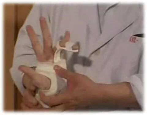环形包扎法:用于肢体较小或圆柱形部位,如手、足、腕部及额部,亦用于各种包扎起始时。绷带卷向上,用右手握住,将绷带展开约8cm,左拇指将绷带头端固定需包扎部位,右手连续环形包扎局部,其卷数按需要而定,用绞布固定绷带末端。