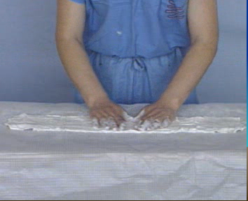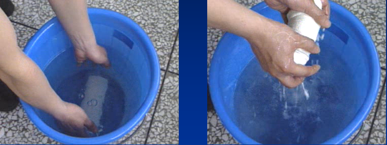 2、石膏绷带在水中停止冒泡时,才取出用两手向石膏绷带卷中央轻轻对挤,除去多余水分。