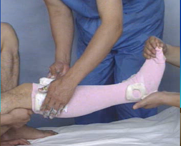 2、石膏夹:将两条石膏条带分贴置肢体的伸侧和屈侧,绷带包缠;用途:多用于已有肿胀或可能发生肿胀的肢体,防止肿胀影响血运。