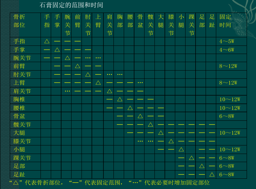 1、石膏托:单托,前后托,U型托,简单,轻便,制动能力差,用于临时制动或较稳定的骨折固定。