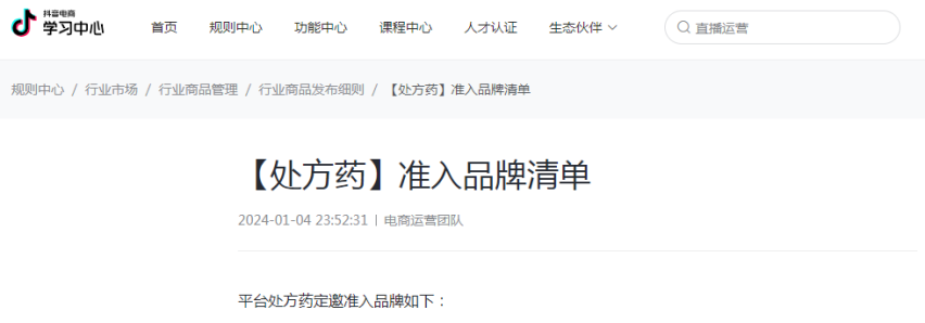 《第一药店财智》独家获悉,1月4日深夜,抖音电商公开上线两则处方药相关公告,分别为【处方药品类管理规范】和【处方药准入品牌清单】。