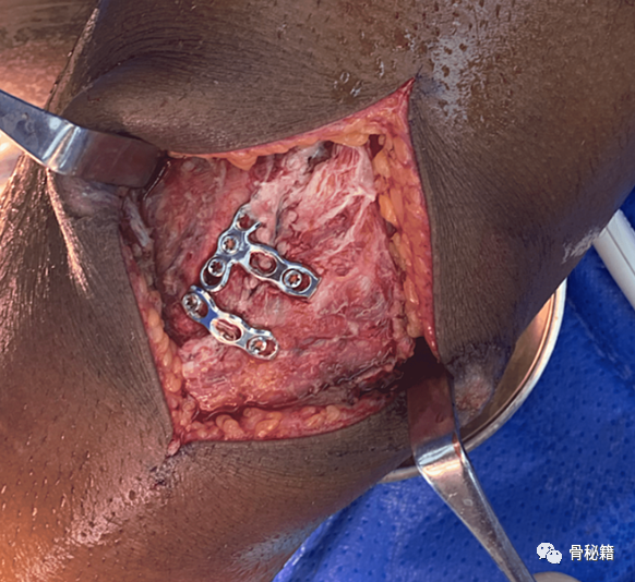 同样,该患者有粉碎型和垂直型骨折,用钢板、螺钉和骨移植物固定以恢复关节面