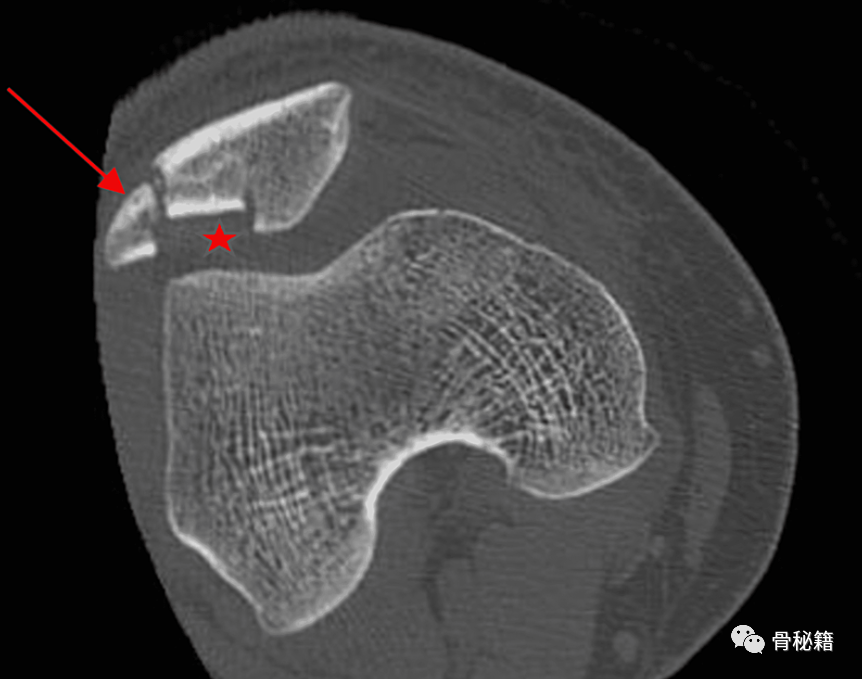 他的右膝CT扫描显示右髌骨粉碎性骨折,髌骨关节面凹陷