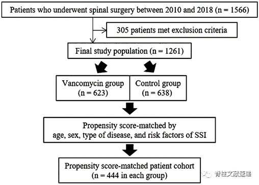 该研究分析后路脊柱手术的1261例成人患者。比较采用万古霉素粉治疗的患者(万古霉素组623例)和不采用万古霉素粉治疗的患者(对照组638例)的SSI发率。