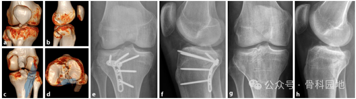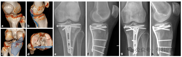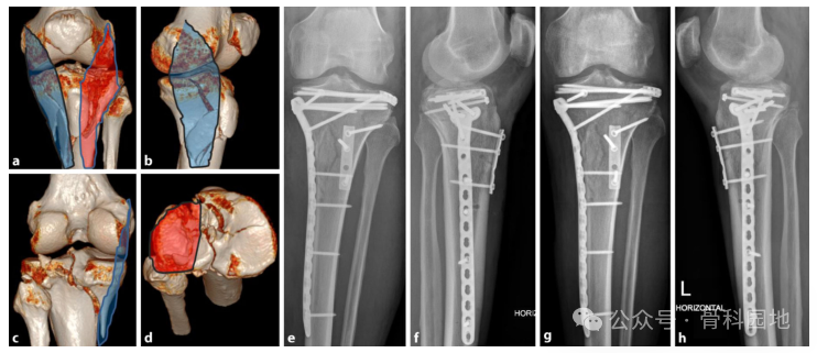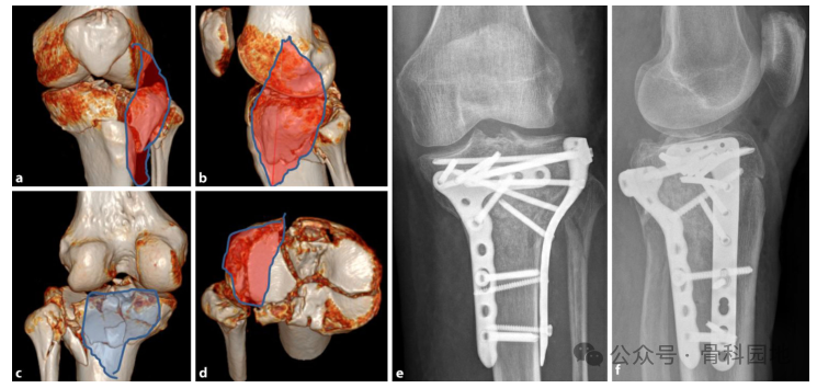 a-d 术前 CT,内侧、外侧和后侧柱骨折。方法:内侧入路,仰卧位固定内侧柱(蓝色)。后柱不需要后方支撑。2. 前外侧入路,观察外侧柱和外侧平台(红色),支撑胫骨结节片段并竹筏钉固定平台。e, f 术后检查。