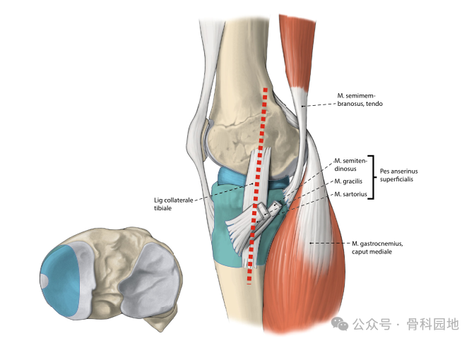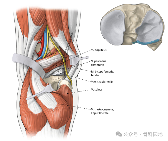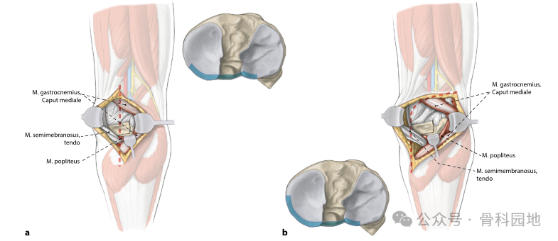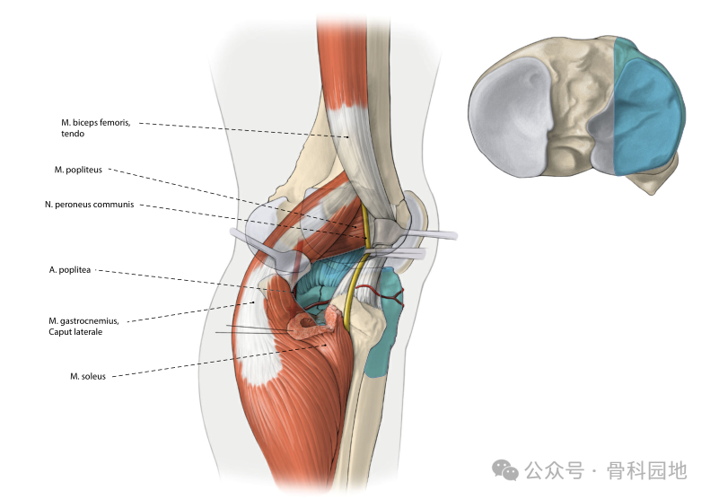 适应症涉及后柱的骨折。这种方法不用显露血管神经束。但只能在关节外侧进行有限程度的直接目视检查。关节暴露仅限于胫骨平台背侧后缘(蓝色)。