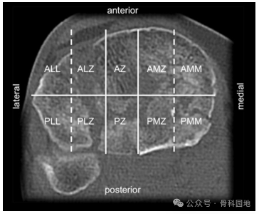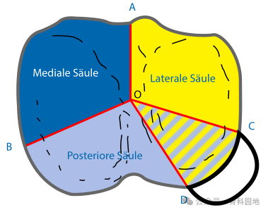 2、Hoekestra 等人将三柱理论改进:胫骨平台腓骨头区域归入外侧柱,而不再归后侧柱--这是考虑到该区域可通过扩展的前外侧入路进行治疗。