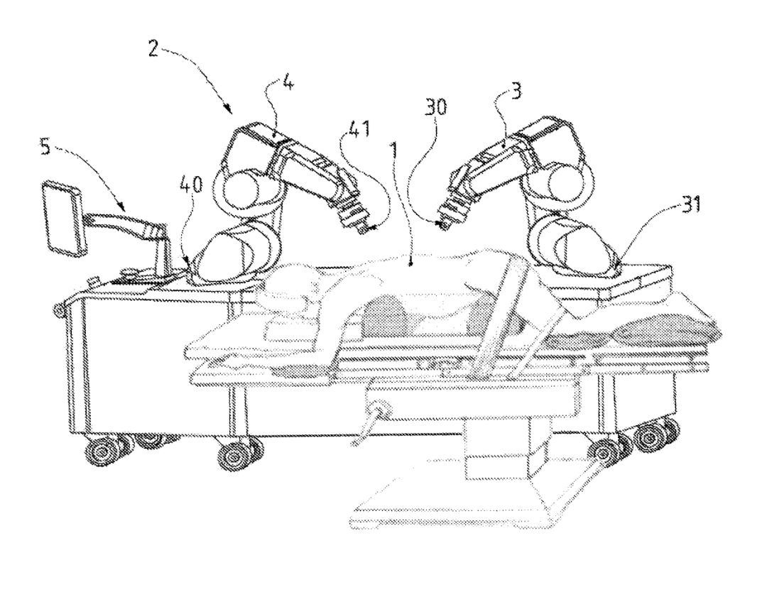 公开/公告号US10159534B2申请日2017-01-30发明名称Robotic-assisted device for positioning a surgical instrument relative to the body of a patient解决的技术问题The aim of the invention is to cope with the drawbacks of the state of the art by providing a device for positioning a surgical instrument relative to the body of a patient using at least a first robotic arm supporting at least One surgical instrument and a second tracker arm, which is also a robotic arm. This second robotic arm is aimed at detecting in real time and accurately the movements of said body and to communicate them to said first arm, so that it compensates its position accordingly. In particular, said second arm permits to detect the internal and external movements of the anatomic area to be treated.技术方案The robotic device for positioning a surgical instrument relative to the body of a patient includes a first robotic arm with a device for rigidly connecting to at least One surgical instrument, a device for anatomical realignment of the first arm by realigning an image that is of an area of the anatomy of the patient, and a device for compensating the movements of the first arm on the basis of detected movements. One version of the device includes at least One second robotic arm having sensors for detecting inner movements of the anatomical area, and a device for controlling the positioning of the first arm relative to sensed inner movements and to the outer movements induced in the second arm.