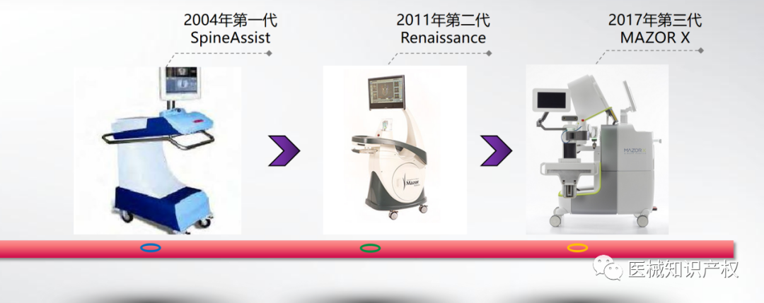 Mazor示意图Mazor机器人的发展已逾20年,总共经历了三次技术更新迭代,分别如下:第一代:为诞生于2004年的SpineAssist,第一代MAZOR脊柱机器人SpineAssit于2004年获得CE&FDA认证,标志着机器人脊柱手术的开端。SpineAssist率先提出利用术前CT影像规划的机器人脊柱手术流程。即采用超前的解剖洞察引擎技术,利用术前CT影像进行手术规划,并于术中通过跨模态影像融合技术将术前手术计划与实际病人体位的骨性结构匹配,以机械臂精准执行手术。这项MAZOR核心科技显著地提升了手术的预见性与精准性,并一直沿用在之后推出的MAZOR机器人上。第二代:为诞生于2011年的Renaissance,进一步完善了术前智能手术规划功能,全局化规划脊柱手术各个关键步骤。在硬件上,Renaissance首次推出一体式患者随动平台技术,将机械臂与患者骨性结构刚性连接,提升了操作与定位的双重精确性。在适应症上,丰富的操作平台选择覆盖全脊柱手术应用。截止2018年统计,第二代MAZOR 机器人共服务超过40.000台脊柱手术,完成植入250,000枚以上脊柱螺钉。第三代:为诞生于2017年的MAZOR X,其在术前智能手术规划功能上实现全面突破,具体包括如下方面:置钉设计、置棒设计、皮肤切口设计、脊柱立线测量、M侧弯分型、植入物选择、截骨矫形、融合计划、术前手术报告等,MAZOR X将以上各个步骤进行全局化手术方案设计。同时在硬件上搭载第三代亚毫米级手术机械臂系统,真正实现脊柱手术的“所思即所见,所见即所得”。