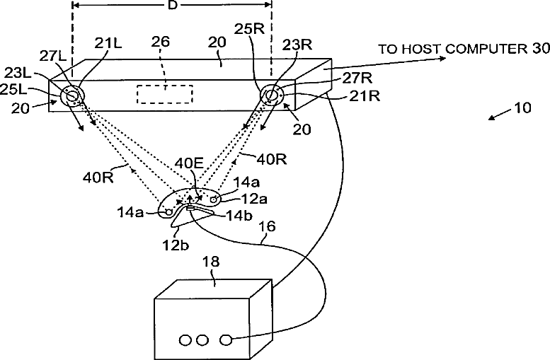 公开/公告号US5923417A申请日1997-09-26发明名称System for determining the spatial position of a target解决的技术问题This invention relates generally to systems for determining the spatial position of a target and more particularly to systems of such type which are adapted to determine the spatial position of both active and passive targets. Still more particularly, 技术方案A system for determining the spatial position of a target having an active target adapted to emit energy in response to an active signal and a passive target adapted to reflect energy impinging upon such passive target from an active energy source. A common energy detector is provided for detecting both the energy emitted by the active target and the energy reflected by the passive target. A common processor is provided for determining the spatial positions of both the passive and active targets in response to the energy detected by the common detector. During a sensor cycle the spatial position of the active target is determined and during a sensor cycle the position of the passive target is determined. The sensor cycles may be interspersed or may be the same cycle to enable simultaneous determination of both the active target and the passive target during a single sensor cycle. The system also enables the determination of the spatial position and angular orientation of both a rigid object having affixed thereto active targets and/or another rigid object having affixed thereto passive targets and/or an object having affixed thereto both an active and passive targets.相关附图
