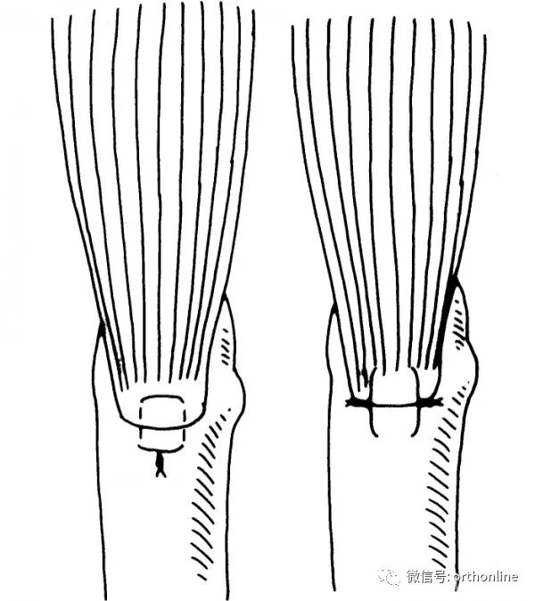 图3-2-1 肌腱断裂钢丝抽出骨面固定法