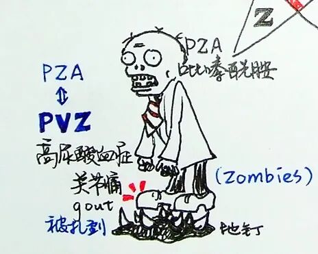 6.吡嗪酰胺,标志是Z,电子游戏《植物大战僵尸》中僵尸就是zombies,玩家有个抵御僵尸的植物就是“地刺”,扎僵尸的足部,引起疼痛,而高尿酸血症引起尿酸盐结晶沉积在足部关节,引起针刺样疼痛😣😣😣😣。