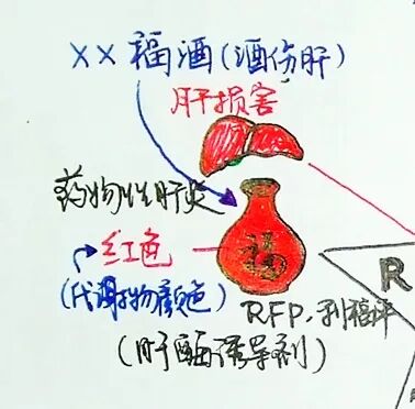 2.利福平,代谢产物呈红色,随尿液排出,所以为红瓶“金六福”酒,而喝酒容易导致肝功能损害,体现利福平对肝功能的损害副作用。利福平是一种肝药酶诱导剂,可以影响体内CYP450酶的活性,使酶的活性增强,代谢速率加快。利福平和其他联合用药后,其肝药酶诱导作用会使其他药物的代谢加快,在体内的停留时间变短,生物利用度降低,药效减弱。