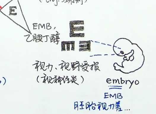 5.乙胺丁醇,标志是E,和视力表一样,而胚胎英文单词embryo首字母也是“E”,而胚胎视力几乎为零,所以该药物会引起球后视神经炎,导致视力受损。