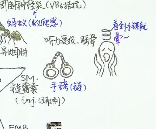 4.链霉素,普通人看到“手铐(链)”就比较害怕,感到害怕头晕,是因为链霉素可能损害第八对颅神经(前庭蜗神经),引起听力受损和眩晕。